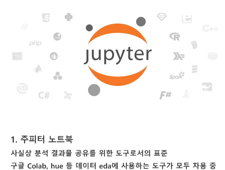 거의 모든 언어 지원(interactive notebook)하며, 다른 툴들이 주피터 노트북을 내장하여 제공함.