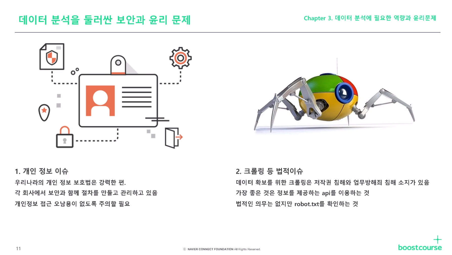 크롤링 법적 이슈 -> 업무방해죄, 데이터베이스 법 침해 등 소송 판례가 있다.