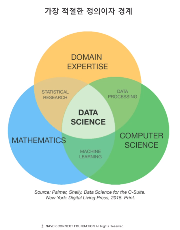 다시 말해서, 직무, 산업에 대한 지식 + 통계적 지식 + 컴퓨터공학적인 기술도 잘 아는 것이다.