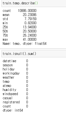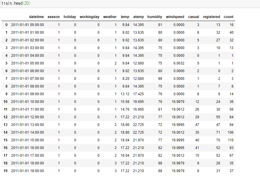 온도, 습도, 풍속은 거의 연관관계가 없다.대여량과 가장 연관이 높은 요소는 registered이다. 이는 등록 된 대여자가 많지만, test 데이터에는 이 값이 없다.atemp와 temp는 0.98로 상관관계가 높지만 온도와 체감온도를 피처로 사용하기에는 적합하지 않을 수 있다.