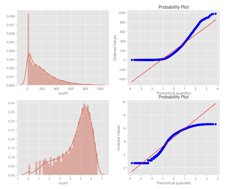 대안으로 이상치 데이터를 제거하고 "count"변수에 로그르 씌워 변경해 봐도 정규분포를 따르지는 않지만,