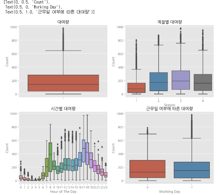 axes[1][1].set(xlabel='Working Day', ylabel= 'Count', title ='근무일 여부에 따른 대여량')