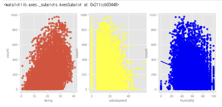 - 왼쪽부터 온도, 풍속, 습도의 산점도(regplot)이다.