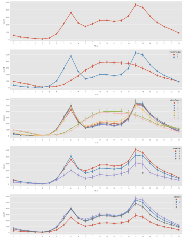 - 5개의 pointplot으로 시각화 , x축은 시간, y축은: hue column의 조건의 개수, hue : 조건