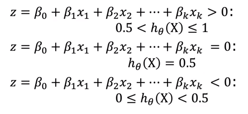 이렇게 0을 기준으로 z값의 변화에 대해 h_θ(X)의 값의 범위도 달라지게 된다.