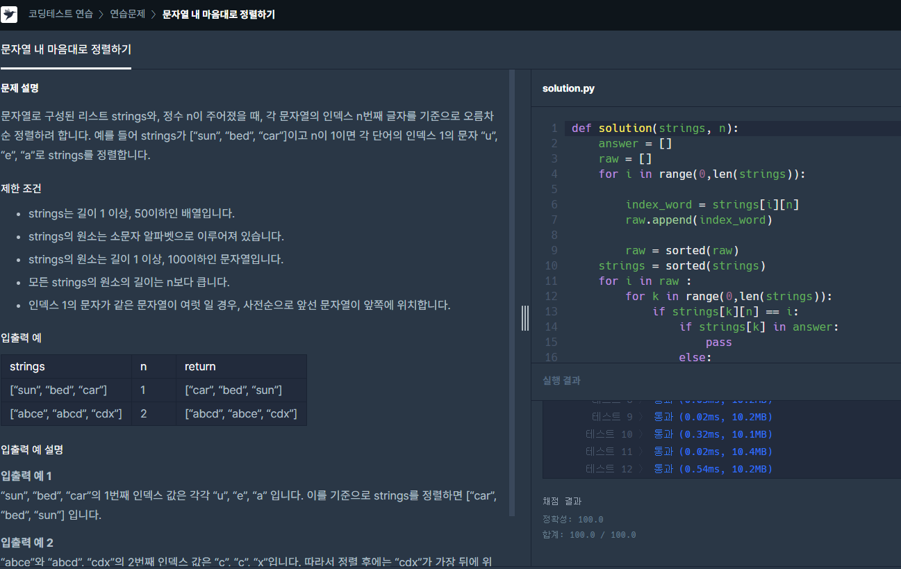 if strings[k][n] == i: # 해당 단어에 n번째 알파벳이 있으면