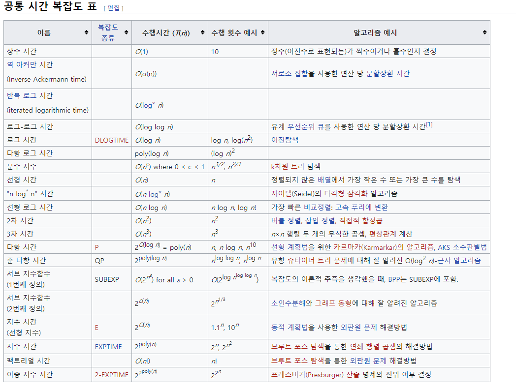 컴퓨터과학에서 알고리즘의 시간복잡도는 입력을 나타내는 문자열 길이의 함수로서 작동하는 알고리즘을 취해 시간을 정량화하는 것이다. 알고리즘의 시간복잡도는 주로 빅-오 표기법을 사용하여 나타내며, 이 빅-오 표기법은 계수와 낮은 차수의 항을 제외시키는 방법이다. 이런 방식으로 표현할 때, (예를 들면, 입력 크기를 무한대로 입력하여) 시간복잡도를 점근적으로 묘사한다고 말한다. (출처 : 위키백과)