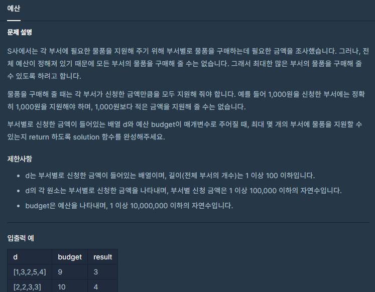 - 예산이 적은 부서일수록 index가 낮기 때문에 index가 0인 부서부터 예산을 할당합니다.